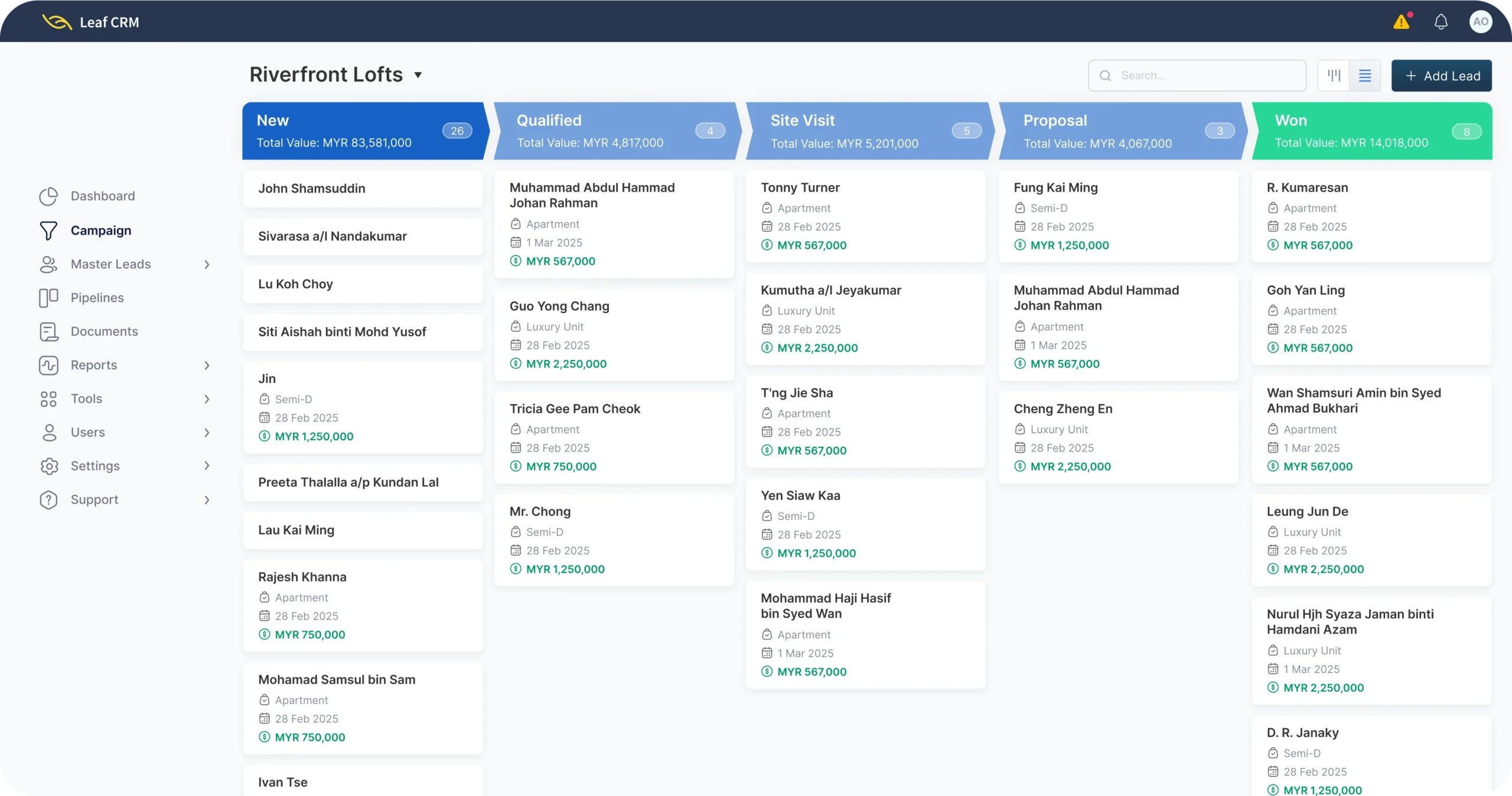 The property and real estate industries are highly competitive, requiring effective customer relationship management. Leaf CRM lets you stay organized, track opportunities, and close deals faster and smarter than ever. Whether you’re an agent, developer, or agency manager, Leaf CRM makes it easier to convert leads into happy homeowners.